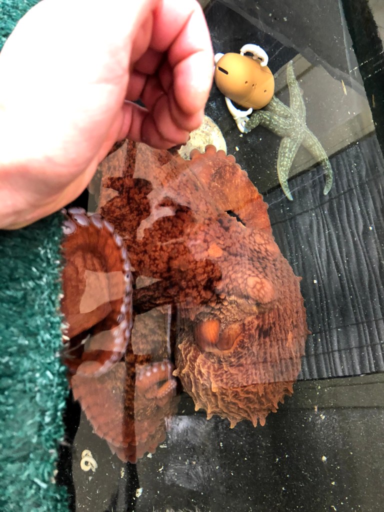 In nature, mothers can range all over the place. Some moms never see their babies, some take care of their babies for a long time, some moms will have one baby at a time, some moms will have many babies at one time… Octopus mothers unfortunately rarely get to see their babies. However, they work very hard so that their babies can hatch and have a life of their own. Once a male octopus reaches sexual maturity he will mate with many females. After the male mates with these females though, he will stop eating and slowly die over the next few months. This process leading to death is called senescence. The male octopus does not contribute to the eggs/babies in any way other than mating. Females only mate one time and then they also stop eating and go through their own senescence (when they stop eating and slowly deteriorate and die). Before a female dies though, she will lay eggs and literally guard them with her life.