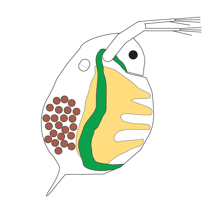 When water fleas are in their eggs, they already have babies in their own eggs. This is showing three generations. The adult water flea is the first generation. The brown circles are the eggs which is the second generation, and inside each egg is a water flea carrying more eggs which are the third generation.