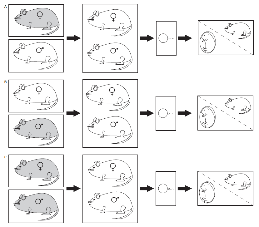 The actual diagram from that mock proposal for that genetics class. Hypothetically mice (in gray down the first column) would be exposed to nicotine. The white mice in the first column were not exposed to nicotine. In group (A) only the females were exposed, in group (B) only the males were exposed, and in group (C) males and females were exposed. All exposed mice were then removed from the nicotine exposure. After a set time after being removed they were allowed to reproduce. We then compare the offspring of each group to see the effects of parental nicotine exposure.