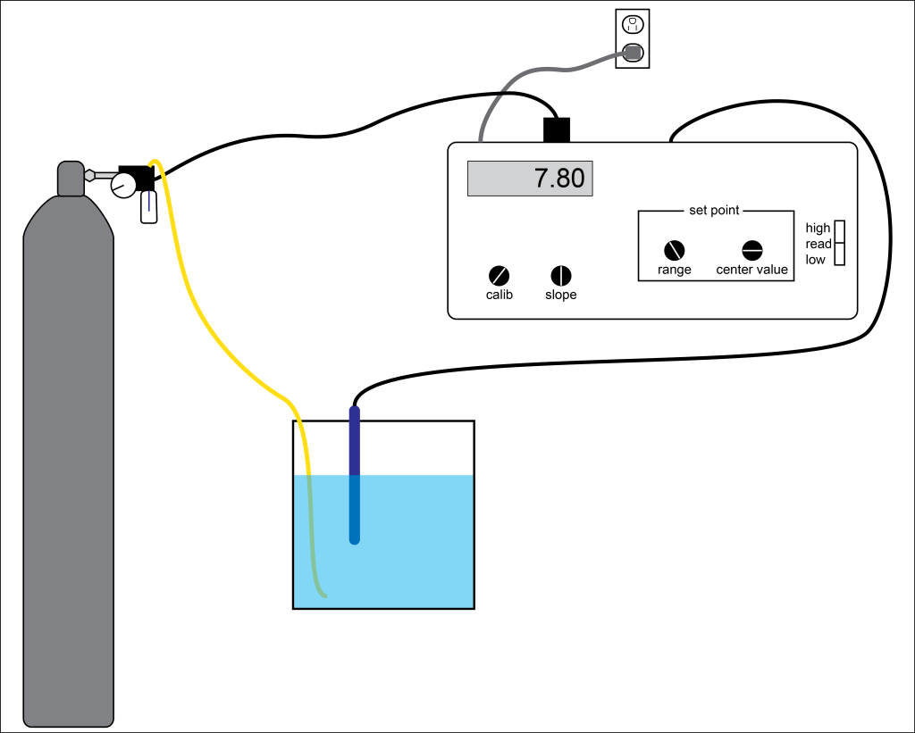 This is showing my water flea set up for how I made the water acidic and how I controlled it. The big gray cylinder contains Carbon Dioxide gas. The rectangular monitor shows the pH (acidification) level. It knows the pH from the blue pH probe in the water. When the pH gets too high the monitor will open up a valve on the cylinder and carbon dioxide will slowly flow into the water through the yellow tube until the pH monitor reads the correct pH in the water again. Then the valve on the cylinder will close and carbon dioxide will stop entering the water.
